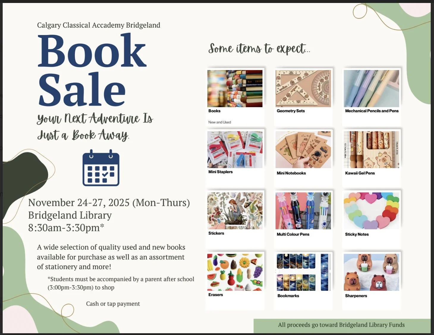 Our annual Library Book Sale is back! Students and families are invited to browse a wonderful selection of new and gently used books, along with fun stationery items such as bookmarks, pens, mini notepads, stickers, and more. Proceeds directly support the growth and enrichment of our Bridgeland Library collection.